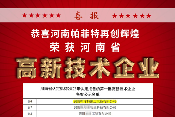 近日,经河南省认定报备、国家科学技术部下属高新技术企业认定管理工作网备案公示,帕菲特顺利通过河南省2023年度高新技术企业认定。